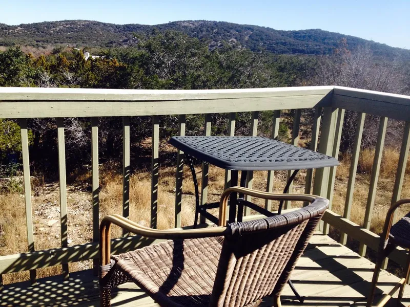 balcony giving you gorgeous hill country views while enjoying the free roaming wildlife and hearing the water splash against the rock bed below. A small screened in porch offers protection from the Texas mosquitos during the summer evenings. A BBQ pit out back along with the creative table & stools situated from large solid rocks makes for fun times eating & enjoying the fresh mountain air. Make this your family get-away year around!