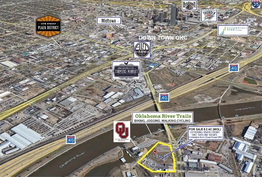 An Oklahoma City APPROVED PUD FOR MIX USE! This OKC RIVER FRONT property measures 5.2 AC (mol) and located at 1501-1511 Exchange Ave. This location offers incredible views of the OKC downtown skyline and the Oklahoma River plus the site is visible from I-40. The owner has provided, AS AN EXAMPLE only, a layout of how this property can be used to develop a luxurious condominium community offering 55 housing units plus room for a restaurant plus bar overlooking the OU boat house and river. This concept includes two dog parks, a swimming pool, club house with a gym, two pickleball courts & one tennis court all in common areas with the restaurant/bar being opened to the general public. The bar located on the 2nd floor could host live bands on the balcony that overlooks the OU boat house and river. Adjacent to this property is the Oklahoma City River Trails. These trails run for 13 miles along the river and pass by many attractions like the Wheeler District located just to the East. If developed for housing, the residents of this community can jump on the trail with ease while leaving their cars at home! Be a part of one of the fastest growing and up-and-coming areas of OKC! Minutes from the famous OKC Stockyards, Downtown OKC, Bricktown, RiverWalk, Mid-town, the Art District, Hotels, NBA Thunder Dome, Scissor tail park, Botanical Gardens & much more. Also located in the empowerment zone, see photos for additional information. All proposed development ideas for the subject site are stated as an example only, therefore all development plans would be subject to approval by the city of Oklahoma City. OKC is being noticed as a place to live as well as invest. In 2028, OKC is set to host part of the 2028 Summer Olympics with the Riversport Rapids hosting the Canoe Slalom events and Devon Park in the Adventure District hosting the softball competitions. "VISION IS THE ART OF SEEING THE INVISIBLE".