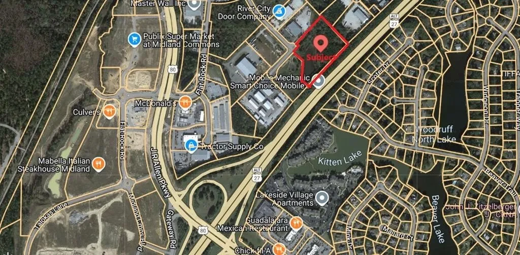 Fantastic location- North-East Cols, within 1/2 mile of the corner from the intersection of US 80/JR Allen ByPass and Flat Rock Rd. 2+/- usable acres on a 5.54 acre site, including detention pond. Driveway will need to go on left side of property. Land behind pond appears to be a good buildable site. Lake could be a very nice amenity view, and beneficial for watering lawn, using as landscape company to water plants, etc.