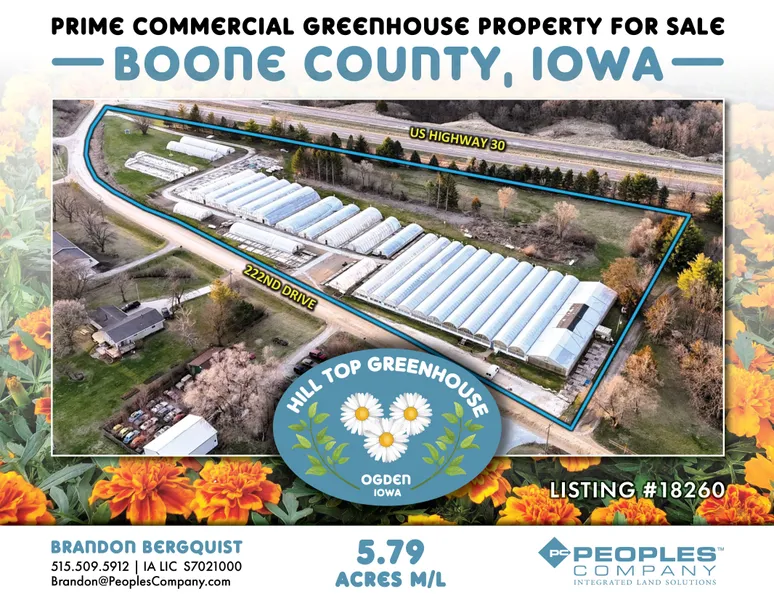 Discover a rare opportunity to own and operate a thriving greenhouse business in the heart of Boone County, Iowa. Hill Top Greenhouse, located near Ogden, Iowa, has been a staple in the community for nearly 50 years. This established, turn-key operation is ready for new ownership to carry on its legacy of excellence.