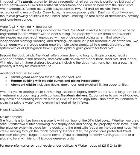 Whether you're seeking a turn-key hunting escape, a legacy family property, or a long-term land investment in a booming growth corridor, The Marsh delivers. Opportunities to own well-located, fully developed hunting land this close to DFW are increasingly raredont miss your chance to claim this private waterfowl haven in the heart of North Texas.