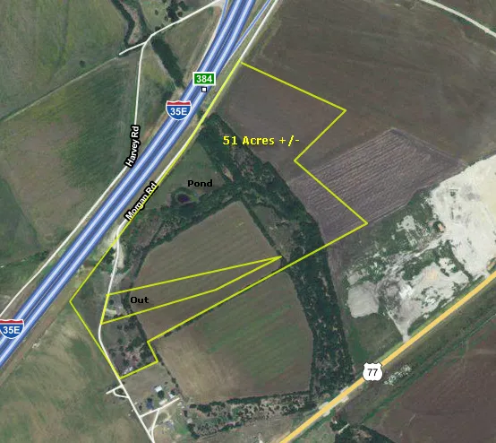 This land is part pasture and part cultivated land with one stock pond. Low taxes if you keep the land in agricultural production. Potential uses are agriculture, commercial, investment, 1031 exchange, homesite. Lots of flexibility since this tract is unzoned and out of city limits. A portion is in the 100 year flood plain but still room for building sites. Immediate access and visibility from I35E. Approx 30,000 vehicle average daily traffic count. I35 exit ramp nearby.