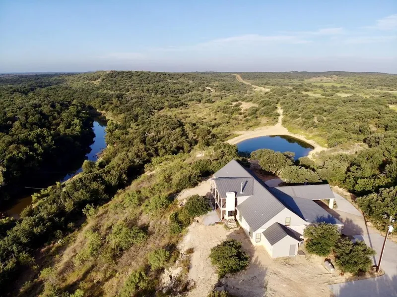 The custom-built lodge was constructed overlooking the Clear Fork of the Brazos River to take in the amazing views of the Texas country side. The lodge is approximately 7,000 square feet, 2 stories with 10 bedrooms, 7 bathrooms, including 2 master suites, game room and large great room with an open kitchen, dining, and living area. The glass walls overlooking the covered patio with a built-in grill really brings the outdoors in and highlights the view of the ranch. Furniture, fixtures, and home furnishings are included with the sale. Current owner had a COOP water line ran to both houses. The owner has recently finished an exterior renovation to the lodge installing a new metal roof, adding brick to the exterior, expanding the parking area, and extending the back patio. Along with the renovations to the lodge the owner also dug a new pond in front of the lodge.