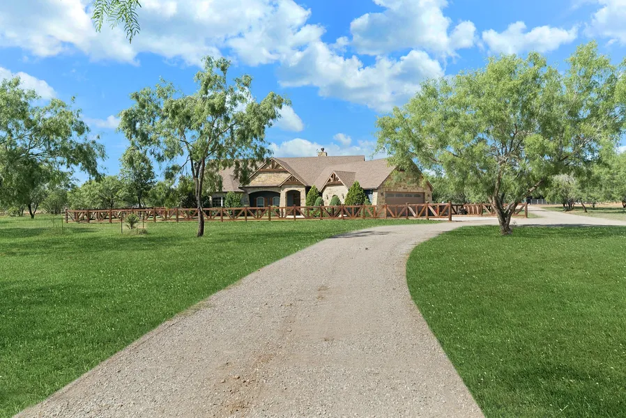 Rare opportunity to own a home carefully crafted in a gorgeous setting with everything in-place for your horses or small cattle heard. The gated entrance with electric opener and crushed asphalt drive usher you past the water well fed stock pond with concrete patio for summer outings. The home comes into view and you immediately know your home. The substantial cedar beamed fence and well landscape yard add to the charm. Inside the home has well defined spaces with a large island kitchen that includes custom cabinets, farm house sink, gas cooktop, all stainless appliances, and a breakfast nook with a beautiful view. Just adjacent is an area currently used as a playroom but could also work as an additional dinning area or a large home office. The living room has a rock wood burning fireplace with gas starter. The primary suite is roomy and has an on-suite bath with claw-foot tub, glass shower, and a walk-in closet. Out back is a larged patio and beautiful backyard with a cross fenced dog run and raised beds for gardening. Also included is a 50'x60' barn with 4 stalls, single concrete drive-thru bay with roll-up doors on each end, an office area, hay/feed storage, and a small bay for parking equipment. There is a set of metal cattle pens with troughs that is nearly all shaded by mesquite trees. The 5 hp water well is plumbed throughout the property to irrigate the Tifton and Coastal Bermuda grass with two included K-Lines.