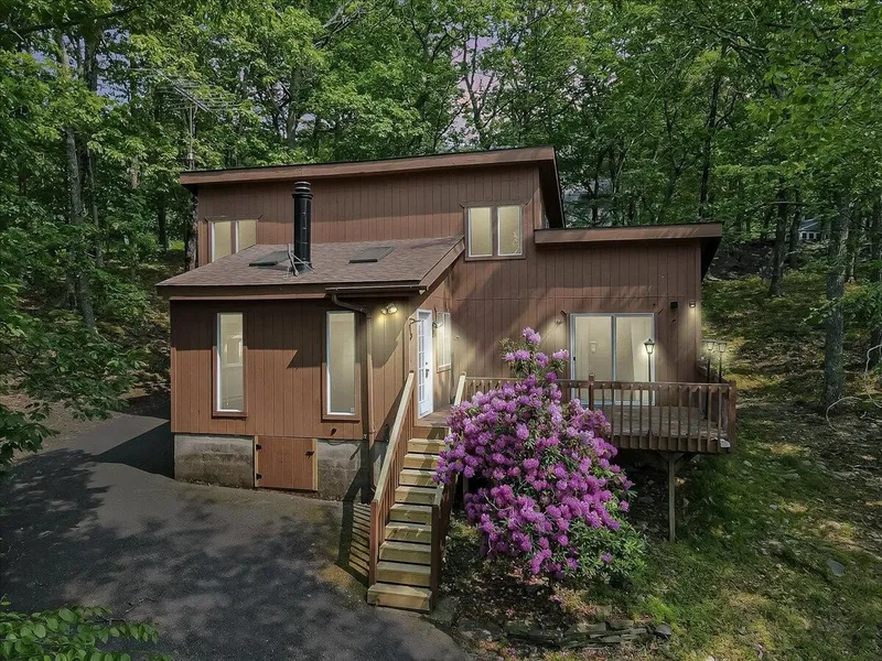 Charming Saltbox-Style Home in Saw Creek Estates - 4-Season Community! Nestled on a scenic mountainside, this freshly painted 3-bedroom, 2-bath home is filled with natural light and character. Enjoy the warmth of a cozy wood stove, an open and spacious kitchen, and unique features like a spiral staircase. Relax or entertain on both the front and back decks while taking in the peaceful setting. Located in the amenity-filled Saw Creek Estates community, you'll have access to indoor/outdoor pools, racquetball, tennis, a ski hill, beach, lake for kayaking, fitness center, restaurant and even a summer camp. Perfect for year-round living or a vacation getaway!
