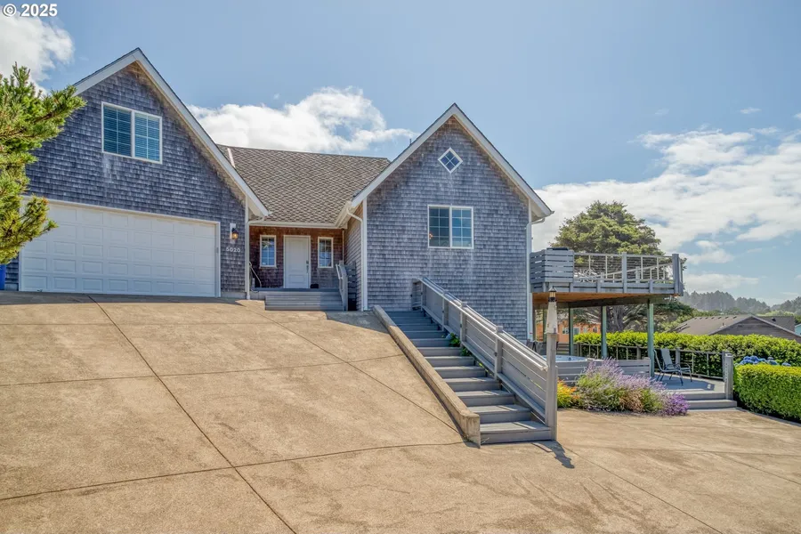 Large home, with views of the ocean, it is just two blocks from the beach, and 1/2 mile from the highly-rated Roads End Beach Recreation Site. This move-in ready, fully furnished home currently sleeps 16 and is ready for you to enjoy time with family and friends. With 4 bedrooms, 4.5 baths, the primary suite on the main floor, 2 living rooms, an upper and lower deck, a hot tub and 2-car garage, there's plenty of space to spread out in this beautiful home. The main floor great room features a living space with vaulted ceilings, natural wood beams, built-in cabinetry, a cozy gas fireplace, and is encircled with windows that offer a panoramic view of the ocean. Cooking and entertaining are a breeze in the great room kitchen with granite countertops, stainless steel appliances, built-in microwave, island with breakfast bar, large dining area, and tiled floors. Relax and enjoy coastal time outside on the large decks with cable railings that provide an unobstructed view, or find a spot to curl up and read a book or play games, including ping-pong or air hockey in the garage. Possible, separate ADU on the lower level with living area, kitchenette and queen futon couch/sleeper. This home, on a quiet street, is perfectly located to walk to the beach, visit the casino or golf course, hike nearby trails with ocean views, shop at the outlets, and visit food carts and grocery stores. Make this beautiful home your next beach retreat!