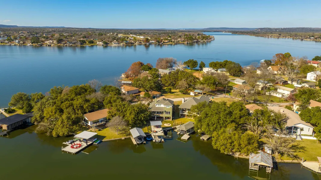 PERFECT LOCATION! East facing lake front on large no-wake cove. On cul-de-sac w/ underground utilities. Large kitchen w/ double convection oven, granite countertops, built in microwave, and beautiful cabinets. Master bedroom with large bathroom. Guest-rooms have own en-suite full bathrooms. Open living area w/ beautiful rock fireplace and lots of light and view of lake. Most of the furniture will be included. Main level covered patio w/ large covered outdoor living space at lake level. Outdoor fire pit for cooler evenings. Amazing boat house w/ storage and 2 jet ski ramps, boat lift and upper deck overlooking the water that is partly open and covered for shade.