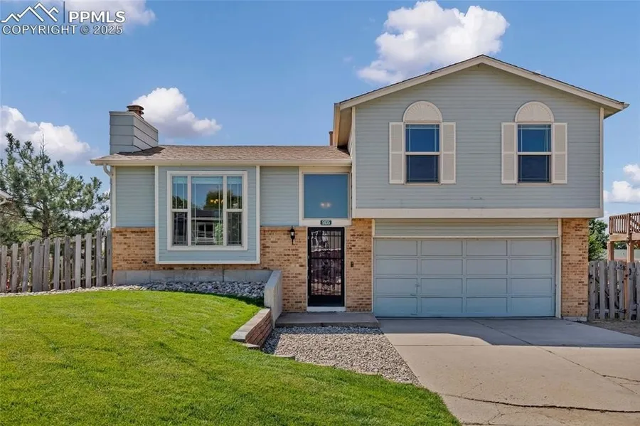 Welcome to this charming tri-level home, ideally situated near schools, Wildflower Park, shopping, and with an easy commute to nearby military installations. Inside, a bright and spacious upper-level living room showcases a large picture window that floods the space with natural light. The kitchen offers convenient eat-in dining, walk-out access, and a seamless flow to the newer oversized composite deck-perfect for entertaining or relaxing while overlooking the beautifully landscaped backyard. Upstairs, you'll find three bedrooms, including the primary suite with a walk-in closet and ensuite bath that also connects to the hallway for added convenience. The lower level features a generous family room highlighted by an elegant brick wood-burning fireplace, creating a warm and welcoming atmosphere. Additional highlights include an attached 2-car garage, automatic front and rear sprinkler system, and breathtaking views of Pikes Peak and the Front Range. Seller willing to leave trampoline.