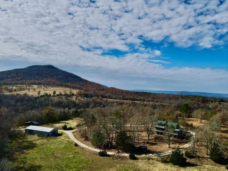 This incredible mountaintop home and 98 +/- acres is hidden just 3 miles off the blacktop down Boat Mountain Road and only 20 minutes from Dogpatch and Harrison, Arkansas. This approximately 3,000 square foot home with rustic woodwork was built in 1997 and is equipped with 3 bedrooms on the upper level and a bathroom on every level. The main level is supported by the kitchen, laundry room, living area, and office. The walkout basement level has a large living area, game room, and utility room. Each level has a large deck providing you with picturesque views in every direction. As an added bonus, there is a 512 +/- square foot cabin that could be used as guest overflow or even storage. The home has a shingled roof, electricity, a water well, and a septic system. In addition, there is a 70'x36' (2,592 square foot) metal shop with electricity, water, a tack room, and 2 horse stalls. The land is mostly fenced and cross-fenced with 15 +/- acres of pasture, 2 ponds, and has mostly gentle rising slopes in the timber. Within the timber, you'll find a lot of flat-level benches with a “seasonal” creek filled with beautiful river-washed stone. Throughout the timbered area of the property, you'll find an abundance of pine, oak, hickory, and other hardwoods. There is also a UTV road that delivers access to the farthest southeastern portion of the property.