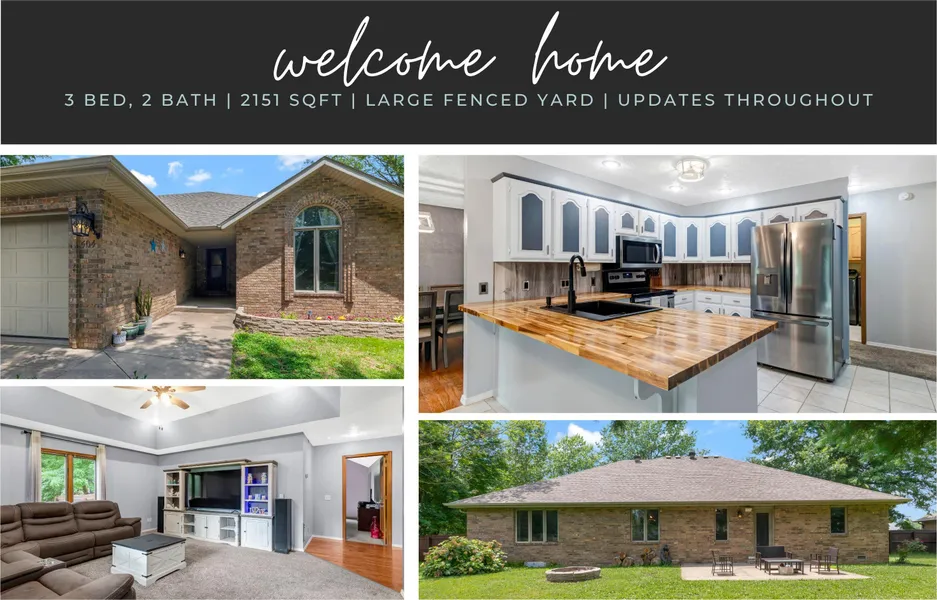 Looking for space? This is the one! With over 2100sqft, this home offers a split floor plan that balances privacy with plenty of gathering space. The oversized primary suite features a jetted tub, walk-in shower, and large walk-in closet. Across the house, you'll find two more bedrooms, a full bathroom, and large laundry room complete with a utility sink. The living room is big enough for a large sectional, full entertainment center, and room to build pillow forts or host game night. Between the living room and kitchen is a large dining room big enough to fit a table for eight, and then some. The kitchen was recently updated with gorgeous butcher block countertops and new appliances and has an open dining area for quick weeknight meals. There's also a built-in desk and tons of cabinet space. Just off the kitchen is the large flat back yard with a new privacy fence, patio, and fire pit-perfect for enjoying a cozy fall evening. Throughout the home you'll find updated lighting and ceiling fans and plenty of closets for storage. The oversized 3-car garage has space for all your vehicles, toys, or projects. This is also where you'll find the utility closet, which houses the water heater that was new as of 2021. Whether you're hosting holiday gatherings or enjoying quiet weekends at home, this property is ready for it all. Located in Clever School District near the city park and tucked into a peaceful neighborhood, this home truly offers space, style, and comfort in all the right places.