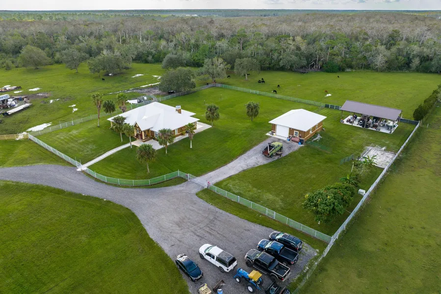 EVERYTHING YOU WANT IN YOUR COUNTRY ESTATE! 20 acres on a paved road and in improved pasture, including 3 paddocks and backing up to Jack's Branch Creek for enjoying deer, turkeys, and etc. Custom concrete block with stucco home boasts a brand new (11/22) galvalume metal roof and is a 4 bedroom, 2.5 bath with formal entry and living room, great room with chef's kitchen, family room with fireplace and dining room plus lots of closet and storage space. The home has a brand new Rheem air conditioning system with a 10 year warranty and a new water system including softener and aerator. The exterior boasts a "rocking chair front porch" enhanced by handsome xeriscaping and a screened porch overlooking Jack's Branch creek line from your back porch or hot tub. The 1200 SF garage/workshop is detached with a 12+/- foot ceiling, 200 amp electric service, and two roll-up doors and has a brand new (11/22) galvalume metal roof. There is also a 1440 SF pole barn/equipment shed that is 13.5' high with 4 bays on an extra thick concrete pad. The property is fenced and cross-fenced with 3 horse paddocks, handsome wooden fencing and an asphalt driveway with equipment parking areas.