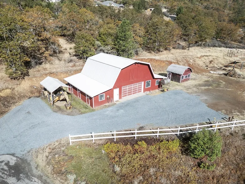 Exceptional property on 7.16 scenic acres along mountainside offers breathtaking views over Rogue Valley from wrap around deck. Perched about third of way up mountain, main residence overlooks a newly lined pond, adding tranquil touch to property. Enjoy convenience of irrigation canal along lower boundary, ensuring lush surroundings year-round. Main home welcomes you through sunlit sunroom to open-concept living & dining area. Cozy up to wood-burning stove or through French doors onto spacious back deck w/ sweeping valley views. Kitchen w/ tile countertops, lots of cabinetry & pantry. Primary bedroom w/ private bath & walk-in closet w/ 2 additional bedrooms & full bath completing home. Impressive 1,000-sqft detached guest suite w/ comfortable accommodations, offering spacious living area, full kitchen, two bedrooms, full bath, laundry facilities. Outbuildings include substantial barn for auto enthusiasts or hobbyists & additional 40' x 80' structure that can serve as workshop.