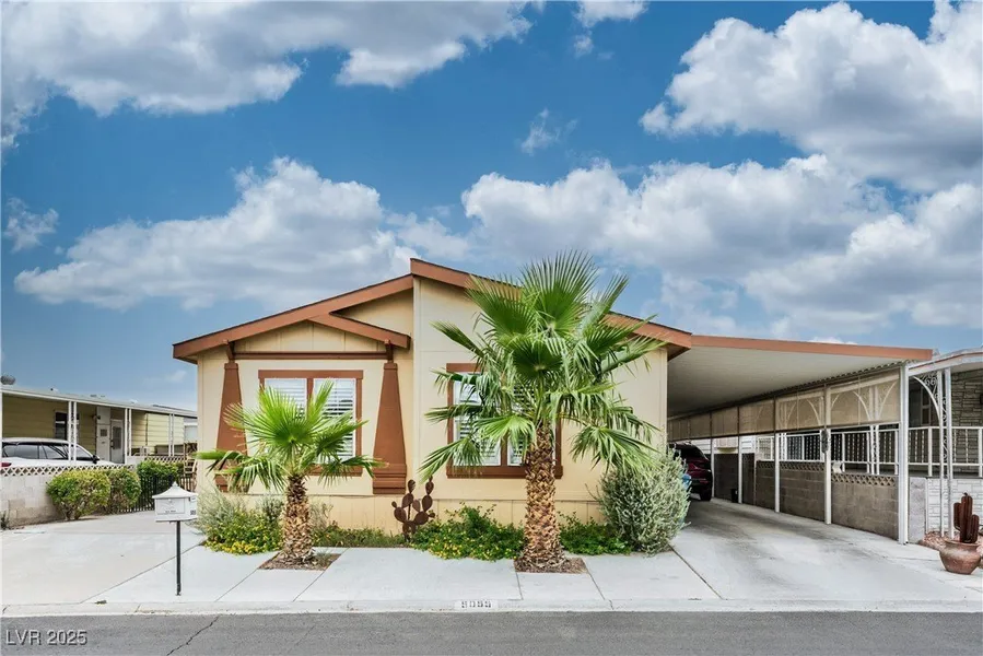 Not just a home, but a lifestyle! This 3 bed, 2 bath home is nestled in Royal Ridge Estates, a gated 55+ community designed for comfort and connection. Upgrades include granite countertops, skylights that fill the home with natural light, newer stainless LG appliances, a cozy gas fireplace, fresh carpet, and a blend of hardwood and laminate flooring. Major upgrades bring peace of mind, including a new HVAC system with a 10-year warranty, a spacious two-car covered carport, an expansive awning with a sunscreen system, and three storage sheds. The primary ensuite offers a step-in shower and a HUGE walk-in closet, while custom shutters and blinds add a refined touch. Community amenities feel like a retreat, featuring a clubhouse, pool, sauna, gym, library, putting green, dog run, available RV parking, and a full calendar of activities. All just minutes from Allegiant Stadium, shopping, dining, medical, and the future ballpark. Low HOA includes water and sewer!