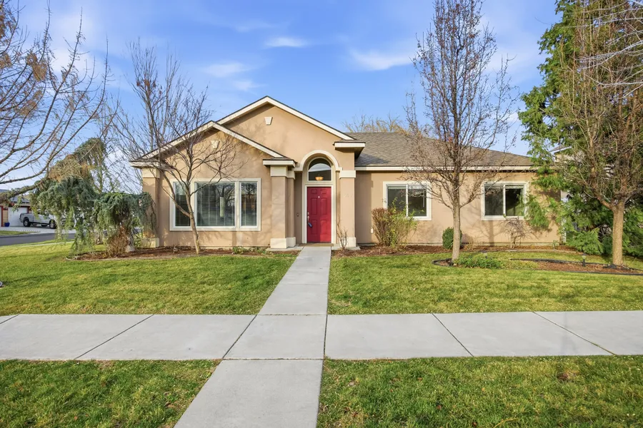Welcome to this inviting home that blends comfort, style, and functionality! Inside, you’ll find laminate wood flooring throughout the main living areas, an open great room with an arched ceiling detail, and abundant windows that fill the space with natural light. Updated trim and millwork add a fresh, modern touch, while a security system provides peace of mind. A versatile den with slider access to the covered back patio makes the perfect office or hobby space. The full spare bathroom and extra storage closets offer added convenience. The kitchen is both stylish and practical, featuring laminate wood floors and countertops, warm wood cabinetry, stainless steel appliances—including a smooth-top range/oven and built-in microwave—plus plenty of canned lighting. An eating bar and pantry complete the space, making it ideal for everyday living and entertaining. The primary suite is a true retreat with a ceiling fan, slider to the covered patio, and a spacious bathroom featuring a soaking tub, walk-in shower, double vanity, and a generous walk-in closet. Laminate floors in the bathroom ensure easy maintenance. Outside, enjoy a large covered patio shaded by a beautiful willow tree, perfect for relaxing or entertaining. The backyard is fully fenced with vinyl fencing for privacy, and the property offers exterior storage, stucco accents, and a 2-car garage. This home offers the perfect balance of style, comfort, and practicality—ready for you to move in and enjoy! ITEMS RECENTLY UPDATED: New interior paint, carpet, garage door & trolly rework, landscaping & tree trimming, professional interior and exterior clean up.