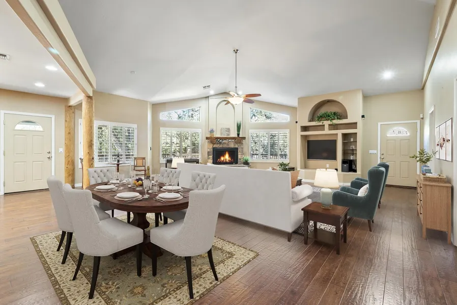Experience living in the woods located in the heart of Payson with NO HOA! Featuring many trees that provide privacy as you relax on the covered or uncovered expansive deck. You are greeted by a vaulted ceiling and beautiful large log pillars, along with a stunning fireplace, elegant wood floors, and plantation shutters in the great room, all contributing to the spacious feel of the wide-open floor plan. The chef in the family will appreciate the ample cabinet and counter space. With the master bedroom suite located upstairs, there is a nice separation from guests or other family members. The primary suite offers a resort-like feel with its generous size and spacious bathroom. There are also two additional bedrooms and a full bathroom on the main floor. Home has full Ethernet capabilities and expansive dog run area. This is a great full-time residence or family getaway!