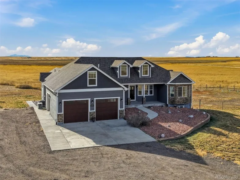 Situated on 40 acres of level, sunlit plains with expansive skies and panoramic distant Rocky Mountain views, this property offers complete privacy with no immediate neighbors ideal for equestrian activities, gardening, raising animals, or pure seclusion. This stunning modern ranch home offers 4 bedrooms and 4 bathrooms across 5,756 total square, featuring soaring vaulted ceilings and expansive windows that flood the interiors with natural light. At the heart of the home is a gourmet kitchen equipped with a large granite island, whitewashed soft-close cabinetry, ZLINE professional stainless range, Bosch appliances, farmhouse sink, and custom tile backsplash perfect for daily meals or entertaining. The luxurious primary suite includes dual walk-in closets and a spa-inspired bathroom with an oversized walk-in shower, rainfall fixture, pebble flooring, and elegant stone and tile finishes. The finished walk-out basement serves as an exceptional entertainment level, complete with a full wet bar featuring stone accents and new appliances, a dedicated wine room, and a home theater with projector ideal for game nights. This level also provides an additional bedroom, bathroom, and a fitness room that can easily be converted to a fifth bedroom. Additional highlights include a water filtration system, an oversized 3 car attached garage, matching chicken coop, and expansive deck offering views of seasonal beauty: spring wildflowers, summer starry nights, and snow-capped Rocky Mountains. A heated outbuilding, originally designed as a kennel, features a sealed concrete floor with full-length wrought-iron trench drain for easy cleaning, a partially completed dog washing station with existing plumbing and framing, and a spacious office area pre-plumbed for an additional bathroom. Escape to your private Colorado ranch retreat at 50950 East Maplewood Place, just 45 minutes from DIA and DTC delivering convenient city access alongside unparalleled peace and privacy.