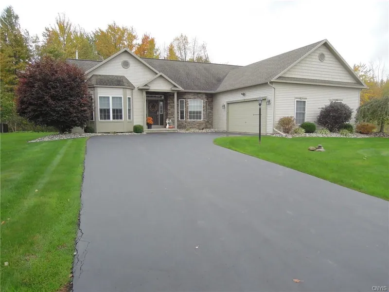 Ranch home in popular Country Meadow custom built by JMG. Stone front accents and courtyard style garage give a distinctive street presence framed by the woods behind the home. You will love the screened in back porch overlooking the private wooded back yard and pond to the side. Popular spit bedroom ranch plan featuring lots of stained hardwood floors, 9 ceilings, soaring vaulted ceilings, gas fireplace with custom floor to ceiling stone surround. Eat-in kitchen features breakfast bar, bay window eating area, plenty of granite countertops, gas range, shaker cabinetry with 42 uppers, & double door pantry. Large & open dining room with trim package, bay window, tray ceiling. Owners suite with bay window seat, crown molding, ensuite bath with dual vanity, tile shower, corner whirlpool tub & large walk-in closet. Open staircase to full basement ready to be finished if extra space is needed. Showings being on Friday 10/29 at 10am.