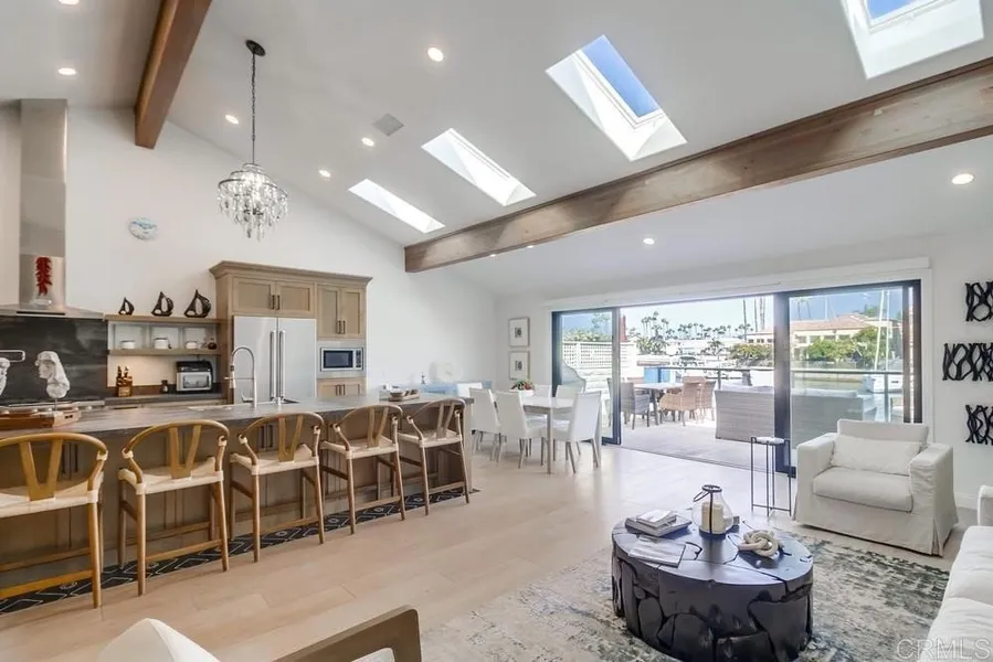 Experience unparalleled coastal luxury with this impeccably remodeled single-level home in the exclusive Coronado Cays. Boasting a bright, open-concept design, this Coastal Contemporary residence features four skylights in the great room, infusing the space with abundant natural light. The entertainer’s gourmet kitchen is a true showpiece, with a central island, Dekton countertops, and high-end KitchenAid appliances—including a wine fridge, refrigerator, 6-burner gas range, microwave, and dishwasher—creating an ideal setting for sophisticated gatherings. Inside, the thoughtfully designed layout offers refined touches throughout, including a private office, a luxurious master suite with an en-suite bath, and a versatile second bedroom. Beautiful chandeliers grace the kitchen and dining areas, adding elegance, while hardwood floors and premium finishes enhance the home’s timeless appeal. Cleverly concealed barn doors reveal both the office and a laundry area with a convenient sink. The master suite is a tranquil retreat, featuring dual vanities and a spa-inspired rain shower. The expansive patio deck offers the ultimate indoor-outdoor living experience, complete with a fire pit and sweeping waterfront views. This inviting space is perfect for relaxation or entertaining, capturing the essence of coastal living. Coveted 40-foot boat slip not included in purchase, but is available for purchasing, making this property an exceptional find for boating enthusiasts. The Coronado Cays community elevates the lifestyle with access to exclusive amenities, boat slips can become available, bay views, a clubhouse, swimming pools, tennis courts, and parks—all located directly across the highway from the Pacific Ocean. With a new roof, exterior siding, and stunning fixtures throughout, this home represents an impeccable opportunity for full-time or seasonal living in a prestigious coastal setting. Don’t miss this rare chance to own a piece of paradise with luxurious waterfront living at its finest.