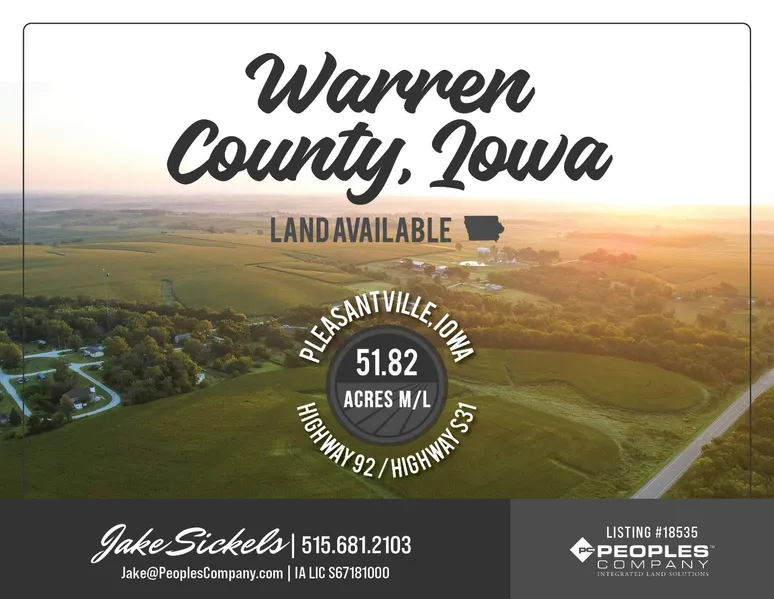 Peoples Company is pleased to offer this excellent 51.82-acre row crop farm with acreage potential, located just west of Pleasantville, Iowa, near the Warren/Marion County line. The property sits on pavement at the Highway 92/Highway S31 intersection near Beech and Sandyville, Iowa. This farm would make a great addition to an existing operation, a solid investment for those seeking quality tillable farmland in a strong agricultural area, or an ideal rural building site within the Pleasantville School District.