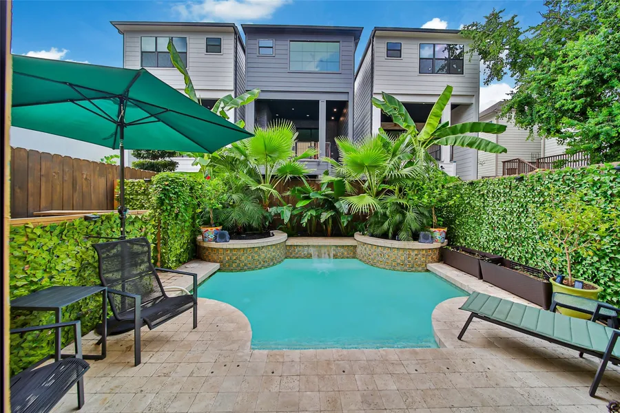 Relax and entertain in this incredible 3-bedroom 3.5 bath home complete with refreshing POOL and tropical landscaping located in the coveted Rice Military community! Thoughtfully designed floor plan that features a dedicated study and full Guest Suite on the first floor with ensuite bath and French doors leading to the backyard oasis. Open entertaining and gathering space on the second floor showcasing beautiful iron work railings on the staircase, recent designer paint, a built-in wine bar, wine fridge, spacious island kitchen, Wolfe and Miele appliances and built in Fridge, breakfast bar, and walk in pantry. Spacious Family room with cozy gas fire features access to two spacious covered balconies. The third floor includes a sprawling Primary Suite with gas log fire, luxurious bath and secondary with ensuite bath. The Primary bathroom includes a large jetted tub, standalone shower, dual vanities and two walk in closets! Just minutes to world class shopping, dining, and entertainment!
