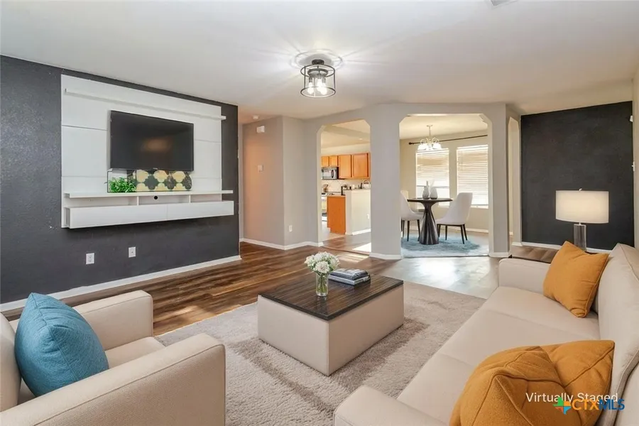 This home makes a statement right from the start, set on a corner lot with a spacious yard that adds both curb appeal and outdoor living space. The backyard is designed for gatherings of every kind, with a covered patio for shade, an open extension perfect for grilling or lounging in the sun, and a storage building that keeps everything organized and out of sight. Step inside and the sense of space continues in the huge great room, where wide-open design meets inviting comfort. Archways frame the way into the kitchen and dining room, creating natural flow for both everyday living and entertaining. The kitchen is a standout with an impressive amount of cabinet and counter space, ready for big holiday meals or quick weeknight dinners. Upstairs, a loft large enough to be a second living room, game room, or home office provides even more versatility. The owners suite is a retreat of its own with a soaking tub and separate shower, the perfect way to unwind after a long day. Recent upgrades, including new flooring in 2023, bring fresh style and move-in readiness. With room to spread out inside and out, and thoughtful touches that elevate comfort, this home delivers space, flexibility, and charm all in one.