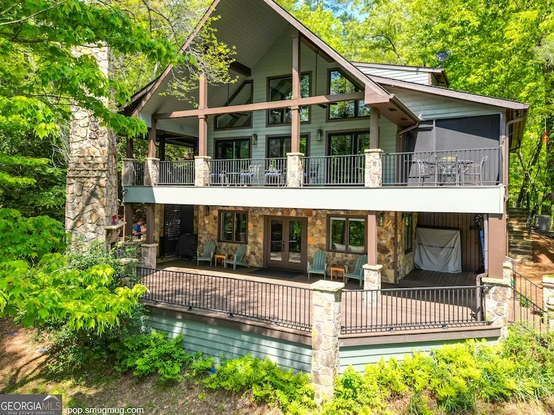This breathtaking lakeside sanctuary features an exquisitely designed layout that spans multiple levels seamlessly blending luxury with comfort. The concrete driveway and spacious parking pad leads to a delightful cottage garden adding a charming natural touch to the property. The covered front porch offers a warm welcome to all who arrive. Upon entering, a floating staircase, adorned with a sleek wire railing that adds a contemporary touch to the home's sophisticated design, leads from the main level to the loft. At the loft level, you'll find a spacious bedroom complete with a large closet, extra attic storage space, and a full bathroom featuring a stunning all-tile shower and marble vanity counter top. The loft also includes a dedicated study area, equipped with elegant built-in cabinetry. Natural light floods through new windows and glass doors in both the kitchen and the great room, providing captivating views of the lake from the main level. The main floor is a culinary dream, showcasing a dining room and a gourmet kitchen equipped with the latest appliances from late 2023. The kitchen features custom storage solutions that maximize space and functionality. Luxurious quartzite countertops are complemented by a striking island with a graceful quartzite waterfall. The great room exudes elegance boasting vaulted ceilings and a cozy stone fireplace that invites relaxation. Adjacent to the main living area is a chic custom half bath featuring quartzite countertops that match the high-end finishes found throughout the home. The opulent master suite features a lavish bathroom outfitted with dual sinks, a private water closet, an all-tile shower, matching vanity quartzite countertops, custom cabinetry, and ample storage. Step out onto the screened porch, featuring an invisible screen system and ceiling fan, which leads to a wrap-around deck with picturesque lake views. This deck with iron rails and TimberTech decking is ideal for entertaining guests and enjoying morning coffee. The versatile terrace level expands your living space and features a mini kitchen and a convenient wet bar, along with another inviting stone fireplace. This level also includes two spacious bedrooms, one of which is a unique bunkroom fitted with two x-long custom oak beds designed and built by an Asheville Craftsman. The full bath features custom granite countertops, a tile shower, a water closet, and custom cabinetry. The utility room boasts a new heating and cooling system (installed in 2023), a washer and dryer with a utility sink, a water filtration system, a tankless water heater, a freezer/refrigerator and more custom storage. All levels of the house have zoned air conditioning with individual thermostats. The thoughtful addition of a mud room, tool storage area with a roll-up door and stone steps connecting to the parking pad facilitate rainy day house entry, tool and bear proof garbage storage. Outside, you'll discover a sprawling terrace-level deck with unobstructed views of the glimmering lake, complete with a grand stone fireplace ideal for memorable gatherings. Additional highlights of this remarkable property include a powerful 24KW Generac generator housed in a beautifully crafted stone enclosure. This home is designed for low maintenance, featuring TimberTech decking and elegant black iron railings throughout the majority of the exterior areas, along with stone pathways and stairs that lead from the house to an impressive two-slip boathouse built (2016). The boathouse features an upper TimberTech deck with iron railing, ceiling fans, lighting, and a mini refrigerator for your convenience. This home epitomizes elegance and low-maintenance living, representing luxurious lakeside living at its finest.