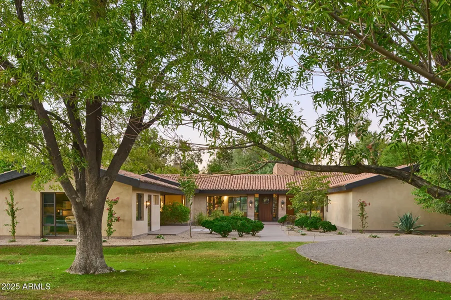 Experience refined living in this stunning custom estate by Tennen Studio, nestled on an irrigated 37,000+ SF lot in the heart of North Central Phoenix. The main residence spans over 5,000 SF with 4 spacious bedrooms, 4.5 baths, his & her offices, and a versatile flex space. Designed with timeless craftsmanship, the home features concrete block and steel framing, integral colored concrete floors, and floor-to-ceiling Crittall windows that flood the interiors with natural light. The chef's kitchen boasts custom maple and hickory cabinetry, marble countertops, a large island, dual ovens, and an Advantium microwave. Entertain with ease in the open great room with retractable sliders leading to a resort-style backyard-complete with a heated diving pool, spa, in-ground trampoline, and Viking BBQ area. The primary suite showcases beamed ceilings, a spa-like bath with Ann Sacks tile, and ample closet built-ins. Additional highlights include a whole-home Savant AV system, Lutron lighting and motorized shades, water softener, instant hot water heater, and underground air returns for energy efficiency. A beautifully appointed 743 SF guest house provides a kitchen, washer/dryer hookups, and a private retreat for guests or extended family. With mature trees, a 3-car garage, and seamless indoor-outdoor flow, this architectural gem perfectly balances sophistication, comfort, and Arizona charm.