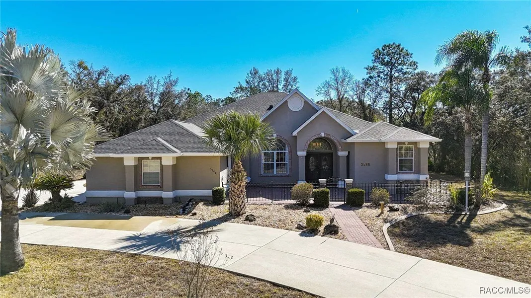 Prepare to be impressed! Starting with a sweeping circular driveway delivering your guests to a wrought iron fenced and gated brick paver courtyard entrance unlike any other! The possibilities of this space are only limited by your imagination! Secondly, the roof was just replaced in July 2025 along with the 5 TON 19 SEER TRANE A/C and all new ductwork in July 2024. The magic happens inside the double-door entrance when you realize that this home is everything and more! Single-light French doors to the right of the foyer showcase the home office with access to the workshop/storage. A grand window in the dining room defines elegant dining and the living room is a perfect space to enjoy conversation. Acacia-woodgrain tile adds an elegant touch to these common-areas. Looking out through the Florida room you'll find a perfectly positioned solar-heated saltwater chlorinated pool for all to enjoy! The owner's suite is complete with attached exercise room (or craft space), tray ceiling, barnwood motif tile floor with faux nail heads, double walk-in closets, double sink vanities, soaking tub and walk-in snail shower. The kitchen has been updated with opposing quartz countertops over cherry cabinets and newly replaced appliances featuring a gas cooktop range plus a walk-in pantry. Floor to ceiling stacked stone surrounds the remote-controlled electric fireplace that offers a visual experience of fire and ice in changing LED colors! Two bedrooms are joined by a Jack & Jill bathroom with walk-in shower and a third bedroom off to itself with a dedicated guest bath and direct access to outside patio for convenience. The laundry room offers utility sink along with another storage closet for bulkier items and the garage is all decked out with ample shelving and plenty of room for 2 cars.