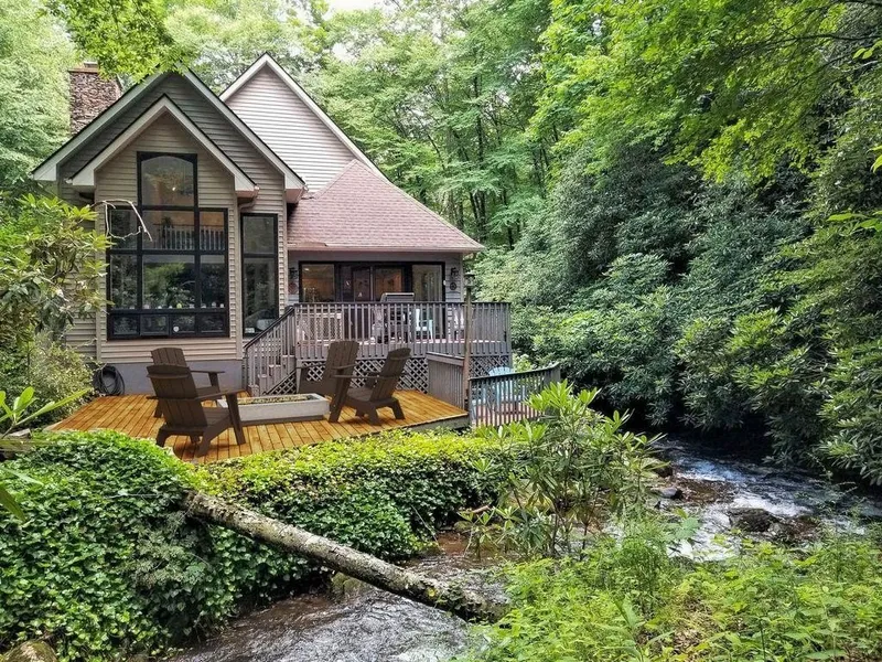 Creekfront custom home on rushing Wayah Creek, perfectly positioned at the forks of 2 trout streams & adjacent to the Nantahala National Forest. This beautifully designed contemporary cabin offers 2 bedrooms, 2 baths & bonus room with extra large sleeping area. High-quality furnishings included, making it move-in ready! Open & airy with vaulted ceilings, abundant windows & natural light. Enjoy the dramatic stacked stone fireplace with gas logs, rich hardwood floors & a spacious kitchen featuring granite countertops, gas range, breakfast bar & walk-in pantry. Multiple rooms overlook lush year-round rhododendron greenery, water & surrounding forest. Main-level spacious master suite includes a private bath, separate shower & soaking tub, and private deck overlooking creek. Upstairs features a second bedroom, full bathroom, living room and XL bonus room with windows, closets & sleeping area. Large multi-level deck with firepit & salt water hot tub is perfect for enjoying the sounds of the year-round flowing creeks. Two separate driveways provide parking for multiple vehicles. Currently a very successful Airbnb. A true mountain retreat with unmatched natural beauty. Paradise.