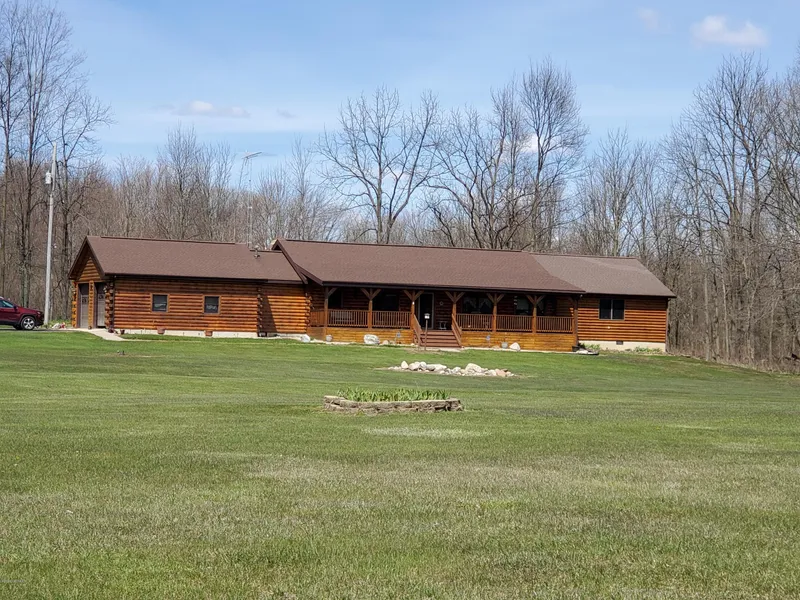 You owe it to yourself to take a look at this property! 27 beautiful, secluded acres with a large, stocked pond and 2 pole barns. This rustic knotty pine walled lodge is all on one level and has been impeccably maintained. If you watch, you might just catch a glimpse of a dinner train passing through on the far side of the property.there are 3 to 4 bedrooms, an open floor plan, 2 1/2 bathrooms and a sun room that is just stunning. The whole house on demand generator and high efficiency furnace are just a few of the upscale features. Hickory custom built cabinets adorn the home and oak cabinets line the attached garage. The front pole barn has it's own well, septic and electric. It may not have a basement, but the 4 foot concrete, lighted crawl space is perfect access and storage.