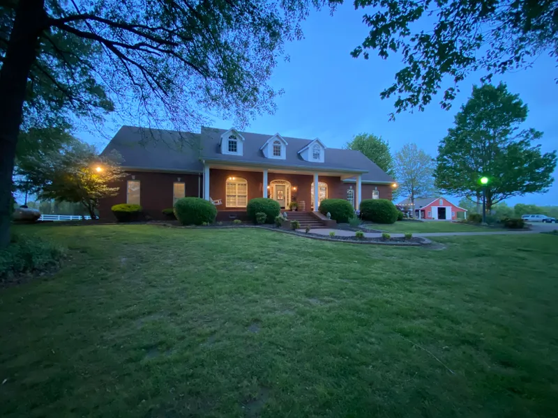 Brick home on hill overlooking wooded lot & 2 sep White Vinyl fenced pastures, 4-stall horse barn w sitting area, Det. 2 car garage heated and cooled Shop w floored upstairs, Salt In ground pool w new liner, pump, and cleaner. Home offers 2bd/2.5bth downstairs.