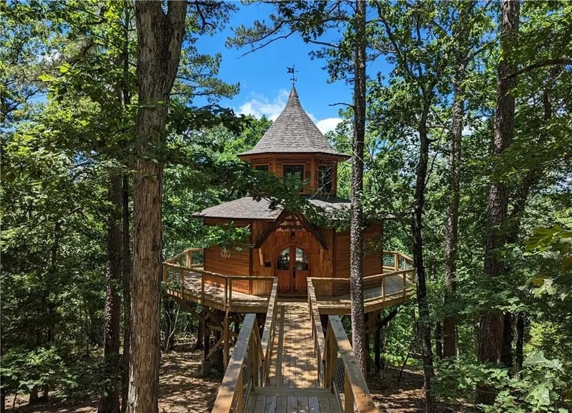 Enchanted Treehouses is a popular luxury treehouse resort offering six custom treehouses and an office surrounded by 52 acres of park-like woods. Each treehouse comes beautifully furnished and has a stone fireplace, Jacuzzi for two surrounded by windows to take in the views, a separate bathroom with walk-in shower, king-sized bed, kitchenette stocked with dishes and cookware, an apartment-sized fridge, microwave, electric counter cooktop and coffee pot, gas grill on the back deck, cable TV and Wi-Fi. Infrastructure is in place for four more treehouses and two platforms have been built with architectural plans for two-story treehouses. You'll enjoy the seclusion and unrestricted land to expand. Live on site in the office or build a home on the property. The perfect terrain to create a trail system and close to trails at Leatherwood and Black Bass parks. Ideal location to expand into the wedding business. Fantastic website and 75,000 Facebook followers. Take the trolley 1.5 miles to downtown shopping and dining.