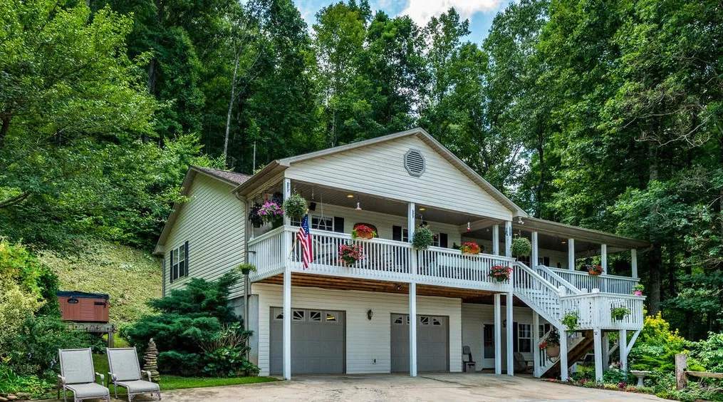 Quiet, serene and private mountain home with gorgeous year round views from the spacious eat in front porch. Great room features stone gas fire place, wood stove, dining area, large kitchen with plenty of storage. 3 bd/ 2 ba upstairs, full living suite downstairs with separate entrance, family room w/ fp, extra room could be office or guest room and full bath. Private hot tub looks out over dramatic views, 798 sf double garage with workshop space, extra parking for entertaining. All this only 3 miles from ziplining and hiking, 15 min to Weaverville and 25 min to Asheville. Perfect mtn getaway, short term rental or forever home.