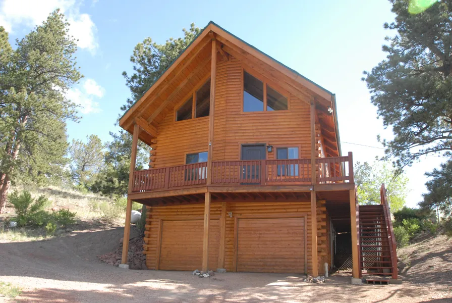 Gorgeous Log Home in the mountains awaits you! Fall in love with this true log construction home in excellent condition on one full acre with 360 degree top of the world views of Pikes Peak, Sangre de Christos, rock formations and the valley below. Main level with great room concept, tongue-n-groove vaulted wood beam ceilings, rich knotty pine floors, highly efficient wood burning stove and abundant windows enhance the warm and welcoming atmosphere. Main level master with wood floors, sitting area and multiple closets. Kitchen has island/breakfast bar and all appliances stay. Upper level has spacious bedroom, bath and loft area. The walk-out lower level features an 11 x 11 Family Room / office or hobby room. Other features include drive-under 2 stall garage, fantastic deck with built-in bench seating, metal roof, central water system and complete privacy. Enjoy the club house just below you with rec room, exercise room, pool and more. Year round beauty and move-in condition!