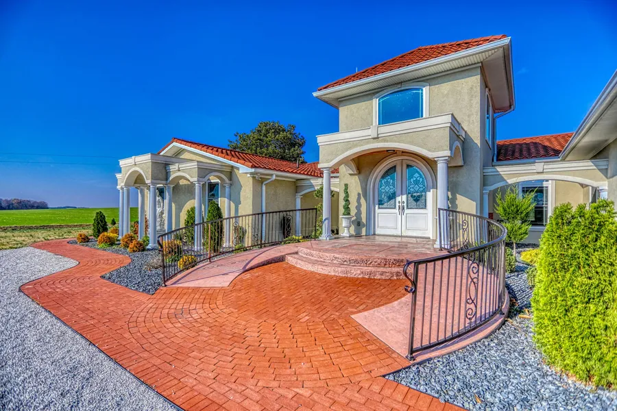 One-of-a-kind spectacular home located in beautiful rural Simpson County. Pastoral views. Mediterranean-style home has 6 bedrooms, 4 of which have their own full bath and all located on the main level. Exterior features include terra cotta-style coated metal shingles, arched entrances, columns, and a cobblestone front plaza. The layout of the home offers so many options including the ability to have 2 separate living areas. The home is on county water and electric, but there is a water well available with valves to allow an effortless switch-over. The house is wired to accommodate the addition of solar panels or a generator if desired. The current owners have meticulously wired the home so all rooms are discretely serviced for electric and cat-6 ethernet. 1-gig fiber optic internet.