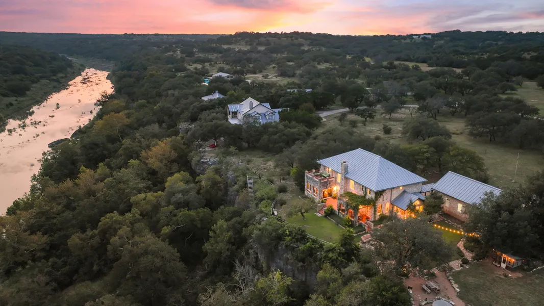 Perched above the canyons of the Pedernales River, Breezy River Villa is a rare Hill Country estate where peace, privacy, and potential converge. Situated on 2.8 acres with 200 ft of spring-fed river frontage, this countryside villa offers a timeless blend of natural beauty, refined craftsmanship, and self-sufficient living, just 45 minutes from Austin. Constructed with native Texas stone and a standing seam metal roof, the 4,549 SF residence is both solid and soulful. Inside, you'll find vaulted ceilings, arched doorways, terracotta floors, granite counters, and panoramic windows framing expansive canyon views. Multiple terraces and a veranda offer quiet spots for outdoor dining, lounging, or simply listening to the breeze move through the oaks. The main house features a grand living room with a wood-burning fireplace, a spacious kitchen and breakfast area, a private sunroom off the primary suite, and a guest wing upstairs with three bedrooms, a lofted sitting area, and balconies overlooking the cliffs. An additional 1-bed/1-bath apartment above the two-car garage provides extra space for guests or rental income. Behind two secured gates, the property feels like a world of its own, ideal as a weekend retreat, family compound, or forever homestead. This stretch of the Pedernales River has never gone dry, even during the most extreme droughts, providing a rare and valuable water source for recreation, wildlife, and sustainability. Multiple purchase options availableup to 37.3 acres in total. Seller is willing to subdivide. Land is currently unrestricted, offering flexibility for a variety of uses. Seller financing available, inquire for terms. This is more than just a home. Its a legacy property with soul, waiting for the next steward to write its next chapter.