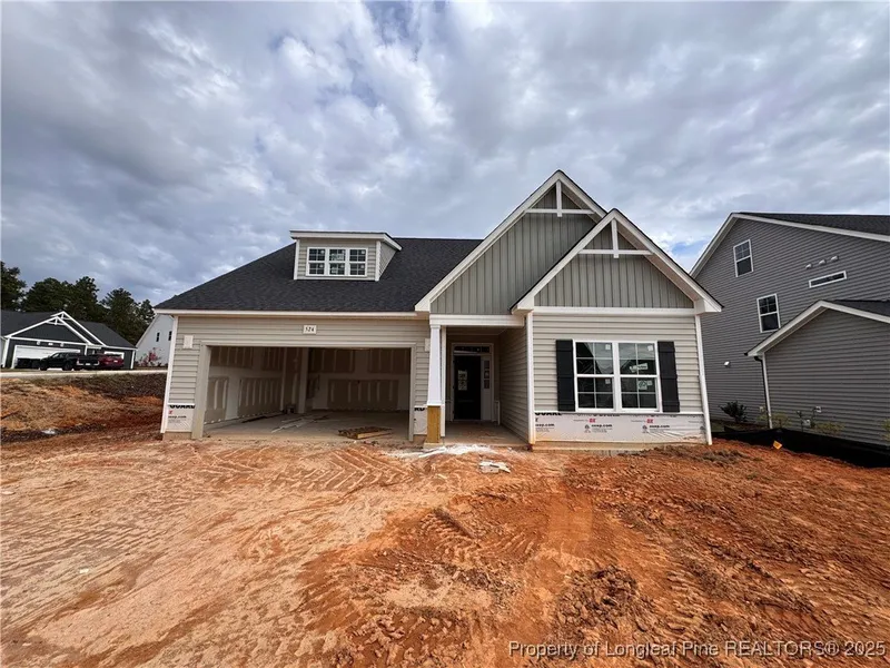 This home sits on a corner lot and offers stylish, low-maintenance living with an open-concept great room featuring a vaulted ceiling with faux wood beam and a gas log fireplace with black granite surround. The kitchen includes an island, 'Trigato' quartz countertops, white shaker cabinets, white herringbone tile backsplash, pantry, and stainless steel appliances, including a microwave, dishwasher, and gas range. The dining area opens to a rear covered porch ideal for outdoor dining. The first-floor primary suite features a tray ceiling with crown molding and an en-suite bath with a white dual sink vanity with a 'Simply White' quartz countertop, walk-in tile shower, linen closet, private water closet, and walk-in closet access.