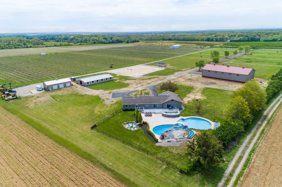 Renovated home set on 11.88 Acre Horse property. Located in the Agricultural Protection Zone this one- of- a- kind property is brimming with possibilities for equestrian, agricultural, and horticultural uses. This newly renovated home with an open and airy feel. Renovated kitchen with granite countertops and Viking stove.Upgraded solar system. 4 zone radiant heat. A spectacular Gunite pool with hot tub, water slide, grotto and waterfalls, travertine patio, and a firepit. Brand new 54x100 Morton building insulated and 200 amp electric. 11 stall horse barn with water and electric, a 2 horse run-in shed, riding arena with freshly graded base and sand arena, new fencing, newly paved driveway to the home, a separate driveway access to the stables, and a 3 car detached garage. Enjoy forever views of surrounding preserved farmland and incredible sunsets. Close to all the North Fork has to offer. Significant time and resources have been invested in the infrastructure-list upon request.