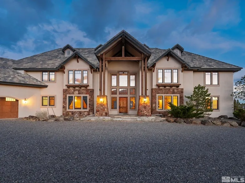 Discover Elegance on the Hillside: A Luxurious Sanctuary in Fernley Step into a world of refined luxury with this exquisite hillside estate, commanding breathtaking views of Fernley to the east and expansive open land to the west. Designed with an eye for detail and an emphasis on quality, this property features spacious bedrooms alongside dedicated rooms for meetings, sewing, office, entertaining and fitness, complete with a sauna, ensuring every aspect of your home life is catered to., Entertain in style in the stunning kitchen equipped with all the modern luxuries you can imagine, including granite slab countertops, a commercial-quality gas Thermador range with pot filler, dual dishwashers, trash compactor, and a center island, all set against the backdrop of gorgeous alder cabinetry. The expansive great room dazzles with its massive fireplace, wood-beamed ceilings, and an elegant wet bar, complemented by a formal living room and dining room. Experience ultimate comfort in the master suite, which features a large walk-in closet/dressing room with a separate shoe/hat closet, and an en-suite bathroom with a walk-in marble shower, deep tub, and dual vanities. Start your mornings in the suite s morning room, perfect for enjoying coffee and pastries without ever leaving the comfort of your bedroom. The large first-floor office provides an ideal space to run a private home business, equipped with custom-built desks, cabinets, a full bath, and a walk-in bank-quality vault room, which can also serve as a second master bedroom. This home has Starlink internet and Wi-Fi capable thermostats. No detail has been overlooked in crafting this 18+ acre estate, from the exquisite finish work to the integrated home system complete with an alarm. The property is fully fenced with tan vinyl, and utilities are pre-stubbed below the hill for potential barn or workshop additions. With a sprawling 5-car garage totaling 2252 sq. ft., and a location just minutes from town, this home is not just a residence but a statement of lifestyle. Perfect for horse owners and those seeking a private, luxurious living experience. Buyer & Buyers Agent to verify all information.