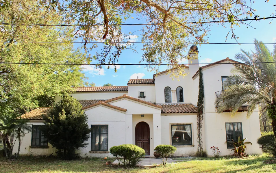 This grand Spanish-Mediterranean style home boasts four bedrooms, five bathrooms, and nearly 6,000 sq. ft. of living space! Just off the front entry, you will find the perfect in-law suite, featuring a walk-in closet, accessible bathroom, and ample space for a sitting area. Opposite the suite is a spacious office, large enough for multiple desks and a library. Beyond the foyer is the living/dining room, with a wood-burning fireplace, A/V system, and sliding door exit to the outdoor kitchen and covered patio. Adjacent to the guest bathroom, a bonus room offers potential as a home theater or recreation room. Finally, a beautiful eat-in kitchen and spacious laundry room complete the first floor. Upstairs, pass through the loft into a second bedroom with walk-in closet, private bathroom, and rooftop patio access. The master bedroom shares access to this patio and includes a fireplace. The unfinished master spa bathroom awaits your personal touch. A generous walk-in master closet, fourth bathroom, and fourth bedroom with private balcony complete the second floor. The half-acre lot could easily accommodate a pool, playground. Enjoy shared private access to Little Lake Fairview and book your tee time at the historic Dubsdread Golf Course, both of which will be just steps from your front door. Just a five minute drive to shops, restaurants, and the highly rated Bishop Moore High School, this gem is in the prime location to meet all of your family's needs. Come visit and imagine the possibilities!