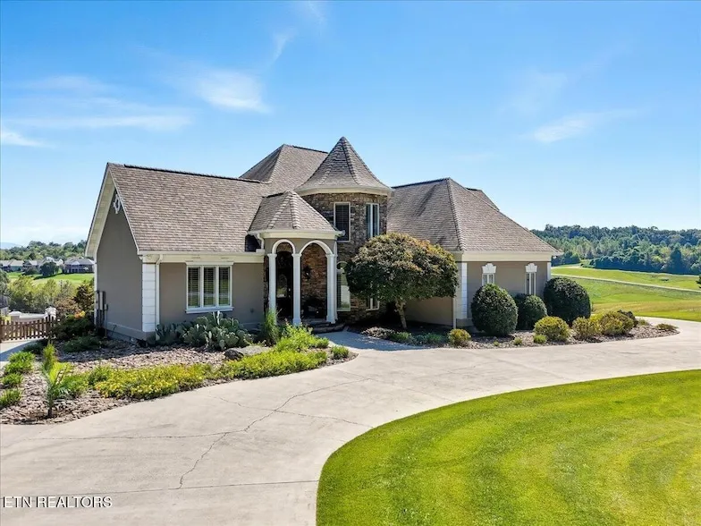 Discover your private sanctuary on 10 rolling acres with breathtaking views of Kahiti Golf Course and distant mountain vistas. This stunning home combines modern elegance with practical luxury, featuring beautiful stucco and stone exterior craftsmanship that catches the eye from every angle. The thoughtfully designed layout spans three levels, offering five spacious bedrooms and three and a half bathrooms. The main level showcases a grand primary bedroom with an oversized walk-in closet and spa-like bathroom featuring a garden jacuzzi tub and dual-head tiled shower. Rich hardwood floors flow throughout the open-concept living spaces, including a vaulted ceiling living room, expansive dining area, and sun room perfect for morning coffee while enjoying the scenic outlook. The lower level functions as a complete guest suite with full kitchen, living room, dining area, bedroom, and bathroom - ideal for extended family or rental income potential. Upstairs, three generous bedrooms share a well-appointed bathroom with dual vanities and convenient attic access. Outside, entertainment reaches new heights with a 20,000 gallon in-ground pool surrounded by an impressive courtyard featuring a U-shaped bar seating twelve guests, complete with full-size refrigerator and ice machine. An outdoor brick fireplace and decorative fountain create resort-style ambiance. Car enthusiasts, hobbyists, and wood workers will love the 2,700 square foot detached garage with climate control and spray foam insulation. The property offers 375 feet of road frontage on Niles Ferry and 700 feet on Mountain View, seasonal blackberry harvesting, and proximity to three Tellico Lake marinas within two miles. Your new East Tennessee retreat awaits you and your family!