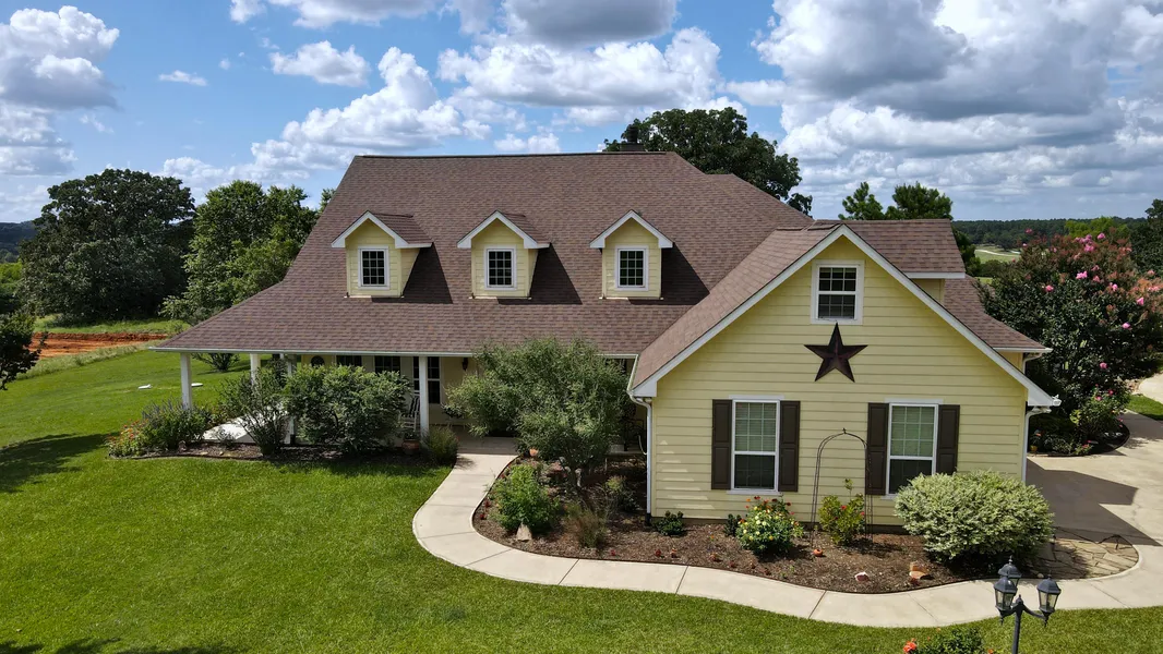 Description: HANDICAPPED ACCESSABLE! Main home custom built in 2010, 3 bedrooms, 3 baths. Two master suites, one ensuite bath has a large roll-in shower; all inside and outside entrances are accessible for wheelchairs, as well as the sidewalks. All the finishes are first rate quality, island kitchen has granite and custom cabinetry. Open floor plan with the den-kitchen-breakfast room open for entertaining ease. Separate space for the formal living, large office, large utility room and a bonus room upstairs. High ceilings throughout, wood flooring, crown molding, fireplace and a screened-in back porch. Guest house is approximately 1,218 SF, 2 bed, 1 bath, open kitchen-living-dining and just as nice as the main home! Outside features include a metal shop building with a double car garage door plus a single garage door, rock patio, dog run, sprinkler system. Water's Edge Ranch is a gated community with a 328-acre lake for fishing, a community pool, pickle ball courts and more. HOA dues apply.