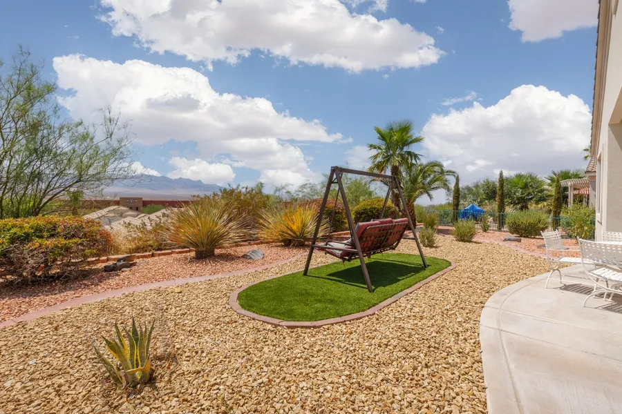 Welcome to your serene desert oasis in Mesquite, NV! Situated on a picturesque lot in a 55+ community, this beautifully maintained home offers panoramic views of the surrounding mountains and a meticulously landscaped yard with palm trees and vibrant natural flora.