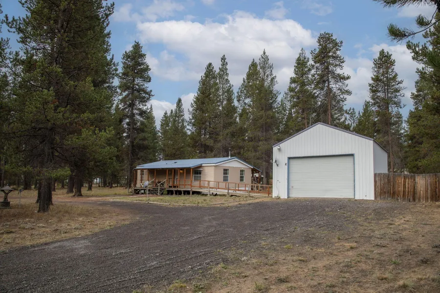 Enjoy calling this 2 bedroom, 2 bathroom home yours! A metal roof and corner Lot with a circular driveway that leads to a large 24ft x 34ft Shop/Garage plus attached 20ft x 12ft shed. The exterior is fenced from the neighbors and has plenty of room to park the toys. Inside, you'll find a functional floor plan with a kitchen skylight, spacious bedrooms, and a wood-burning fireplace.