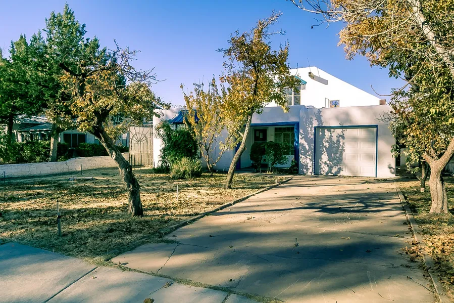 Circa 1936 Nob Hill area house with huge detached workshop (24X20)! New in the last 12 months: roofs, stucco, water heater, evap cooler, 2 mini-splits, refinished wood floors, washer/dryer, water supply lines from street to house, and garage door. Original wide-plank white oak hardwood floors + vigas and stained-glass accents. Open kitchen with cathedral ceiling; fridge conveys. Living, dining and family rooms + loft with floating staircase. Three bedrooms, 1 with kiva fireplace. 1 full + 3/4 + 1/2 baths. Huge detached workshop (24X20) with 10-foot ceilings, 220 electrical, evap cooling and gas furnace. Separate storage bldg. 1-car garage. Laundry room; washer/dryer convey. Thermal windows except historic front living room window. Popular location close to UNM!