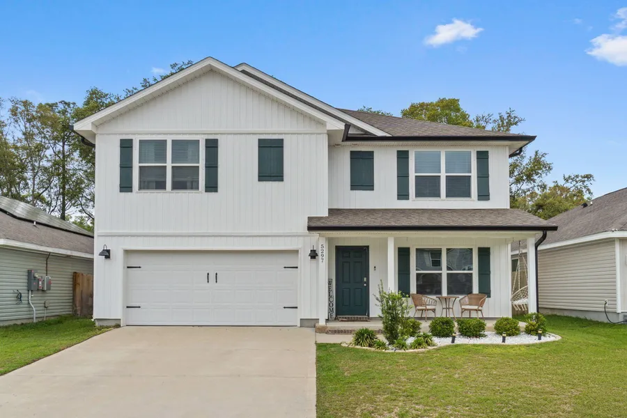 Welcome home to this fantastic 5 bedroom (plus an office AND upstairs loft/living room!), 3 bathroom home located in the popular neighborhood of the Woodlands centrally located in Pace and minutes from I-10, Hwy 90, NAS Whiting Field, UWF, shopping, restaurants, and the Emerald Coast's beautiful beaches. Pull into the community and you're greeted with sidewalks, street lighting, underground utilities, and even a neighborhood park, playground, and splash pad to enjoy those hot summer days! The Hayden floorplan is a beautiful 2 story design with over 2550sqft! As you enter this home, there is a flex space that is perfect for an office, formal dining room, or school room. Through the foyer is the large open living space joined by a gorgeous kitchen and dining area with access to the backyard. The kitchen features all stainless appliances, tasteful tile backsplash, and lots of counter space with a fantastic upgraded wooden framed kitchen island and it's open to the eat in kitchen area. Interior features also include luxury vinyl plank flooring throughout, with plush carpet in the bedrooms, upgraded lighting, and plenty of closet space! There is one bedroom and one full bathroom located on the first floor, and upstairs are the 4 other bedrooms along with a great sized upstairs living room (with a closet!), and the laundry room. The master bedroom is retreat with an oversized room and an en suite featuring two walk in closets, double vanities, a walk in shower with glass door, and private water closet. Upstairs there is also another full bathroom with double vanities. Outside you'll love the updated landscaping and the addition of whole home seamless gutters along with the fully privacy fenced in backyard. Welcome home to 5297 Peach Drive where you'll get all the space you've been looking for within a fantastic neighborhood!