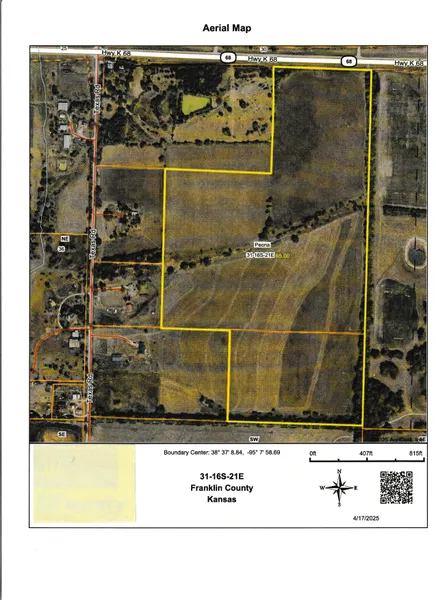 Welcome to this beautiful 65 +/- Acres in Eastern Franklin County, KS! Located on Kansas Highway 68 with utilities nearby. This property would make an awesome place for your private home or possibly a rural estate development. Currently the land is in Hay production and would make a great horse property as well! Acreage, taxes and address are estimated and waiting survey and county approval.