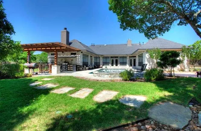Outdoor - As you exit the house and onto the flagstone pool deck you quickly realize what the current owners passion is.. Outdoor Entertainment! After a dip in the full size, lighted/heating swimming pool, you can then conveniently feed your guests by preparing and grilling in the outdoor kitchen with granite tops all situated under a dark stained wood trellis. After your gourmet paper plate swimsuit meal, have your guests follow as you lead them across the flagstone island pavers through lush green grass and onto the 900+ sqft. deck just in time to catch the most breathtaking sunset theyve ever seen. When the stars light up the hill country sky and the night starts to cool, its time to gather round the stone fire pit for some star gazing and storytelling, or maybe just relax in the custom built hot tub with waterfall. Regardless of your speed of outdoor entertainment, Lost Valley Ranch has the perfect amenities in place to maximize your familys outdoor enjoyment.