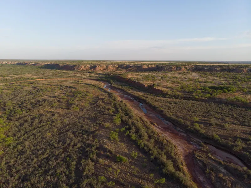 Two major drainages run through the South Division of the Caloosa Ranch. The Salt Fork of the Brazos River meanders in and out of the south boundary. Scenic rocky ledges and cliffs overlook this wide river bottom. South Camp Hollow heads just south of CR 350 and flows in a southerly direction and flows into the Salt Fork. Numerous other header creeks and draws meander through the ranch providing a very scenic, broken and rolling appearance.