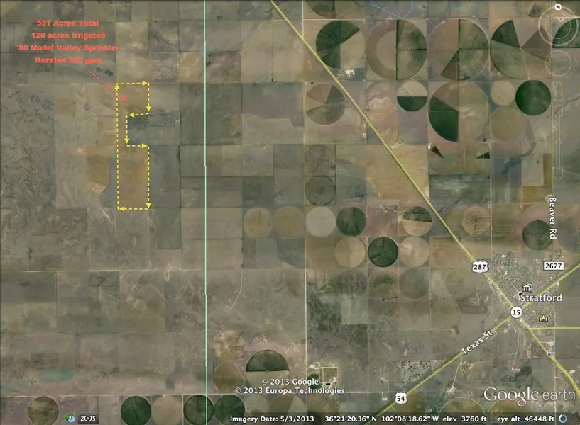 Full Description: Priced Reduced-531 acres located in northeastern Dallam County, with 1 well and 1 80's model Valley Sprinkler nozzled at 500 gpm. Balance of acres are dry land.
